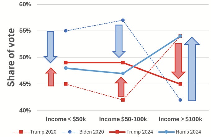 Since the 2000 election Democrats have firmly been the party of the managerial class, the overly educated, the credential-laden laptop job-having masses. Exit polling data shows further educational polarization. The Democrats are firmly the party of post-election Instagram poem-posting and national days of grieving after elections. Guys, I hate to break it to everyone here, but life is pretty ok. I’m not saying there are not incidents of hardship, but if your day job consists of working on a laptop and you live in an economically mobile environment, you’re probably not thinking about what you’re eating next week. You probably don’t know anyone who experienced a death of despair. There’s a severe level of comfort that we experience.