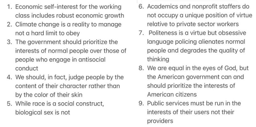 Ben Shapiro is already on record calling this list essentially “conservatism” — which I think is an indication it’s heading in the right direction (not because it’s conservatism, but because spineless Republican goons are trying to discount it). Some quick comments on a few items: