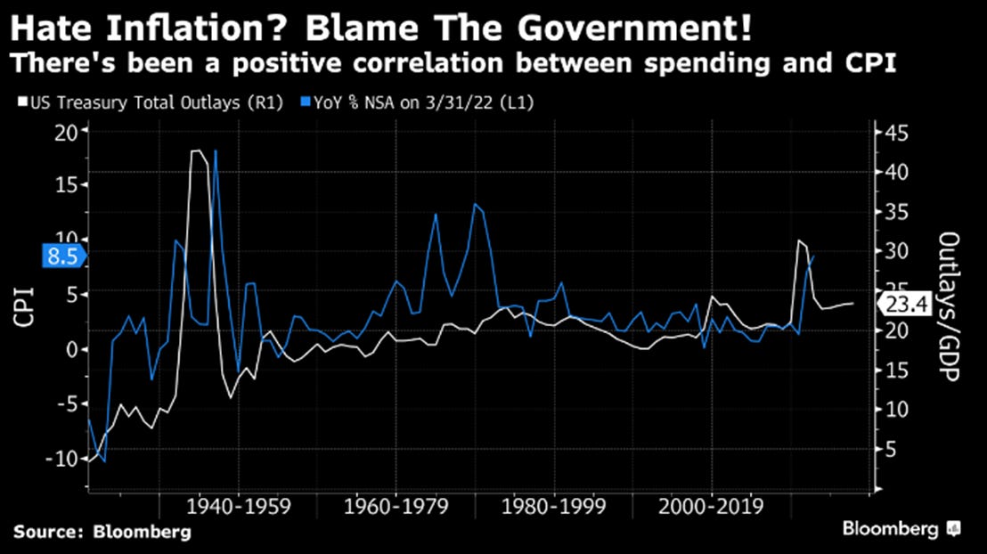 Are politicians to blame? Together, they passed trillions in stimulus which saved millions of Americans from falling deeper into poverty by providing a life vest when it was most needed. It shored up personal balance sheets across the country and created an environment where many Americans were more financially stable than before the pandemic (although, asset price increases have a large role to play there). It is true to say that higher government spending is bound to drive higher inflation, just see the chart below. The government is a buyer of goods and services, so when you encourage it to spend, it will drive higher demand, illustrated below.